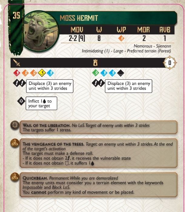 The Moss Hermit is, as advertised, a big treeperson – 8 wounds, Nemorous, and most importantly, large. Large is a unique skill for Sÿenann, and as a refresher, does the following: